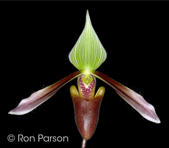 Sold out Paphiopedilum dayanum #5118 selfing (approximately 25 seedlings per flask). The Species: First described in 1895, this comes from Sabah, Borneo on the lower slopes of Mt. Kinabalu in secondary forest where it is found growing in moss and leafy humus as an epiphyte, lithophyte or terrestrial. The elevation range is 1000 to 4760 ft. The inflorescense has a single flower which is up to 4.3” tall. The leaves are 6 to 8” long, 2” wide and wonderfully patterned. In nature temperatures are stable through the year. Days average 80-84F and nights average 59-62F. Culture: Potting mix should be moist but not soggy. Repot before the medium breaks down. Water with dllute fertilizer. Parent: Paphiopedilum dayanum |